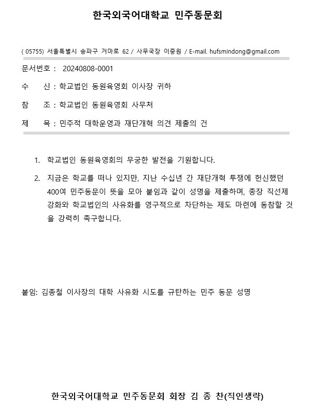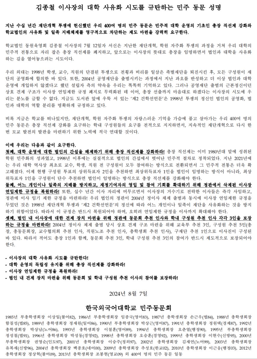 8/7(수), 김종철 이사장의 대학 사유화 시도를 규탄하는 민주 동문 성명 발표,