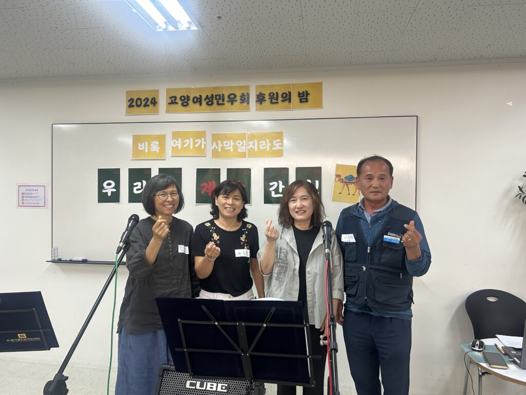 이도영 동문이 대표로 있는 고양여성민우회는 활발하게 지역활동을 벌여나가고 있는 여성단체입니다. 힘든 시기에도 고양여성회가 더욱 발전하기 위한 후원의 밤이 지난 9월 24일 열렸습니다. 외민동에서 김복남 부회장, 조직의 어머니로 불리는 이수진(신방85) 동문, 이중원 사무국장이 참여해 응원의 마음을 보탰습니다.