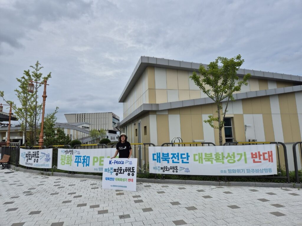 파주 접경지역에 사는 분들은 우리가 생각하는 것보다는 전쟁의 위험을 더 심각한 수준으로 맞닥뜨리고 있는 것 같습니다. 파주에 사는 윤설현 동문은 1인 시위 등을 포함한 투쟁을 진행하고 있습니다. 한반도 평화를 위한 중단 없는 투쟁을 통해서 전쟁위기가 잦아들고 평화의 기운을 내오려 노력하는 윤설현 동문에게 뜨거운 동지애를 전합니다.