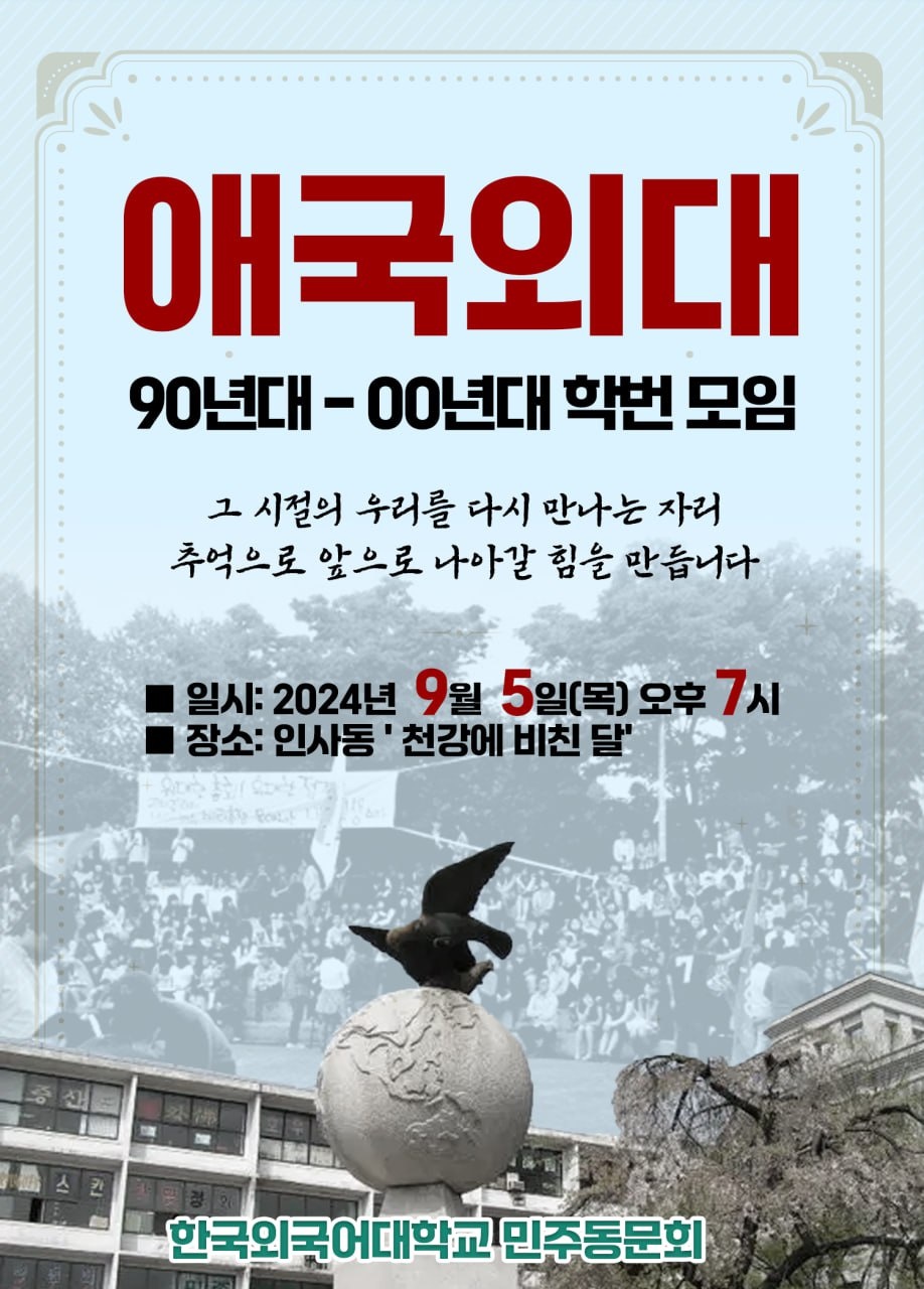 1990년대~2000년대 학번 동문 30여 명이 지난 9월 5일 저녁 7시 천강에 비친달에서 모임을 가졌습니다. 외민동의 차세대 주역들이 모여 서로 친목을 나누며 외민동에 대한 관심을 공유했습니다. 조만간 1990년대~2000년대 학번들이 선배들의 자리에서 더 가열차고 발전된 외민동을 이끌어갈 날을 기대해봅니다.