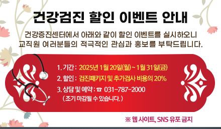 건강검진에 관심 있는 동문들에게 알려드립니다. 외민동 부회장을 맡고 있는 김기중 동문이 자신의 직장인 분당서울대 병원 건강검진 프로모션을 소개했습니다. 분당서울대병원은 연2회 명절을 앞두고 정상 검진비용 대비 20%를 할인해주는 건강검진 프로모션을 진행한다고 합니다. 내년 1월에도 해당 프로모션이 진행된다고 하니 필요하신 분들은 참고해주시기 바랍니다. 예약 시 교직원 인적사항을 물어보면 명함을 참고해 답변하시면 된다고 합니다. 동문 여러분의 건강을 기원합니다.