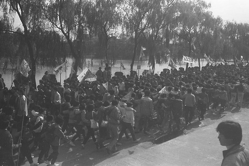 1986년 10월31일 경찰의 진압작전이 끝난 후 건국대 행정관 옥상에서 한 학생이 허탈한 듯 건물 아래를 내려다 보고 있는 모습ⓒ건국대학교 제공