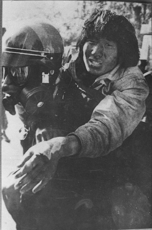 건대항쟁 4일째인 1986년 10월31일 건국대 건물에서 부상당한 학생이 경찰에 엎혀나오는 모습.ⓒ건국대학교 제공
