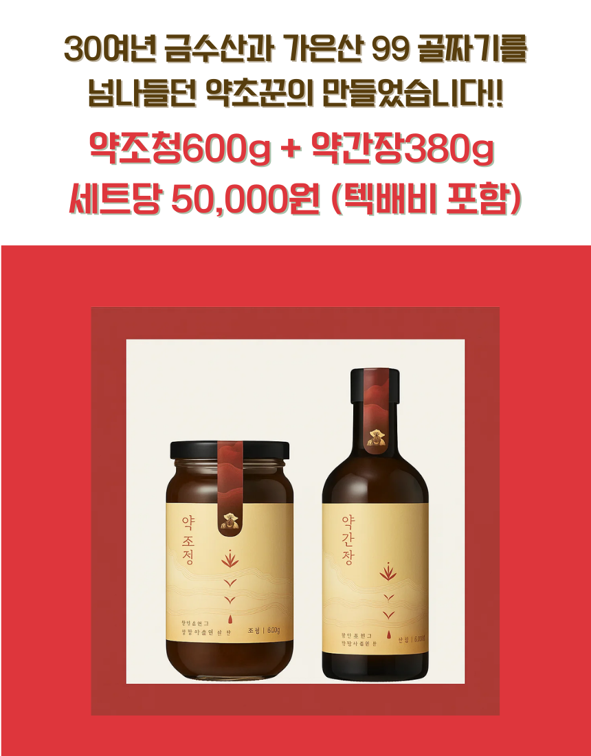 - 소개: 30여 년 약초 장인 정신으로 정직하게 담근 조청과 간장. 선물용으로 안심 추천.